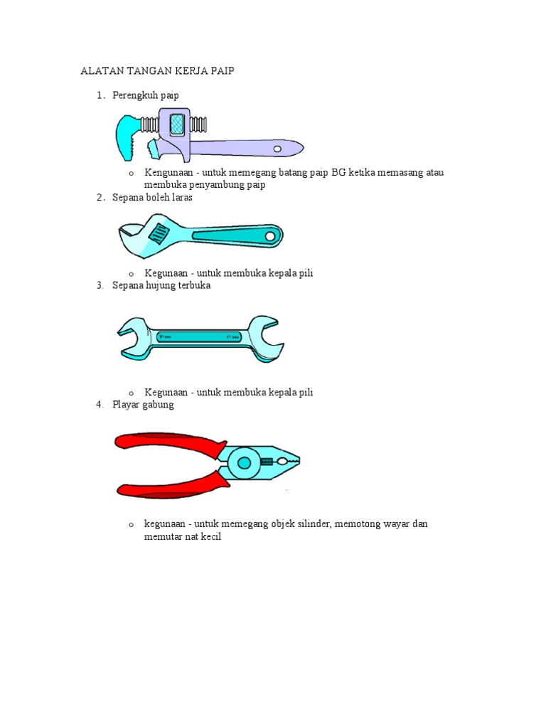 Berhati-hati semasa menggunakan alatan dan bahan. Playar gabung kegunaan - untuk memegang objek silinder memotong wayar. Perengkuh paip Kegunaan - untuk memegang batang paip BG ketika memasang atau membuka penyambung paip 2.