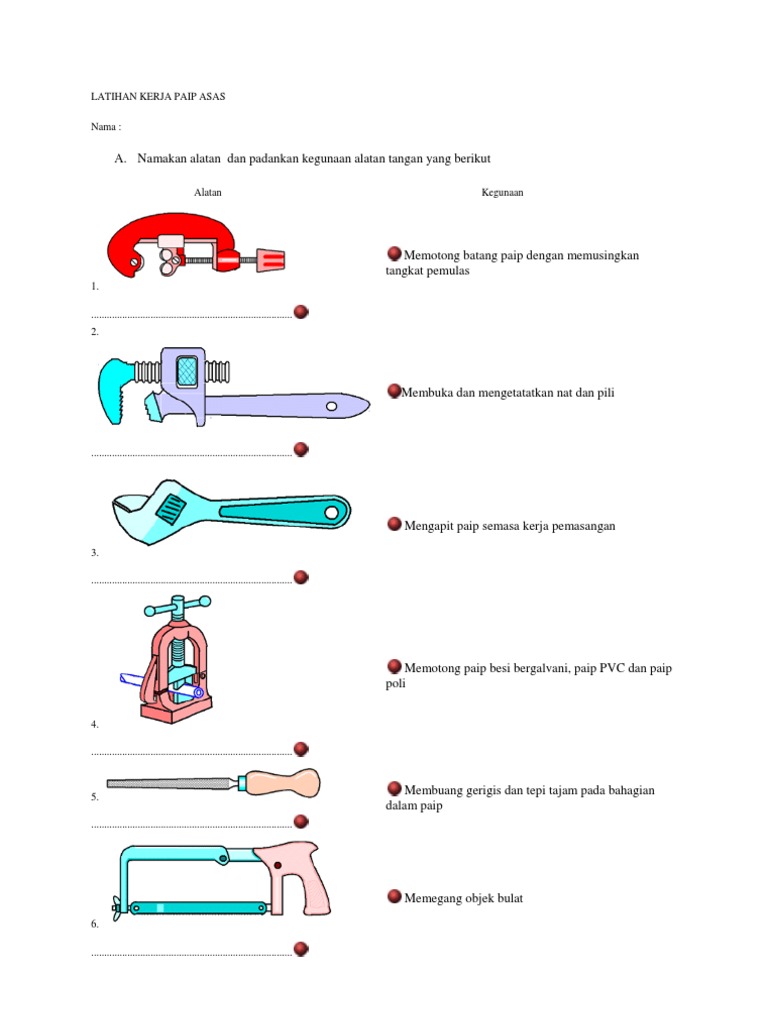 Nota kemahiran hidup tingkatan satu kerja paip asas alatan tangan kerja paip 1. Spanar hujung terbuka Kegunaan - untuk membuka kepala pili 4. Jenis alatan tangan ialah pita pengukur gergaji besi pemotong paip yoke ragum paip yoke kikir bulat kikir rata pemotong paip PVC perengkoh paip sepana boleh laras playar cengkam seribu mengenalpasti jenis nama bahagian dan fungsi tangki simbah.